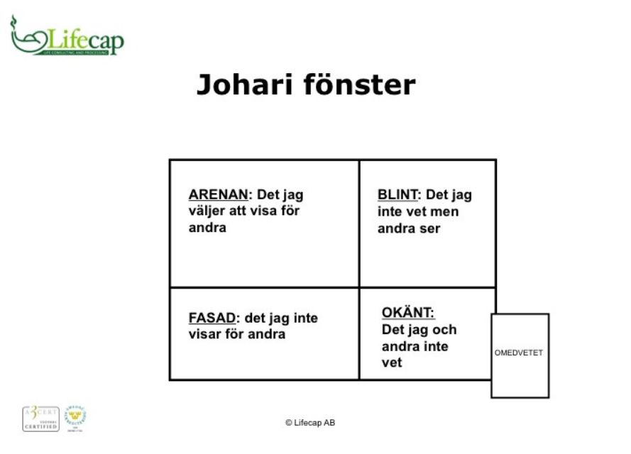 1. Arenan – detta utrymme visar vad jag vet om mig själv men även vad gruppen känner till. Arenan karaktäriseras av ett öppet utbyte mellan mig och andra. Rummet blir större när förtroendet mellan gruppmedlemmarna ökar och deltagarna utbyter personlig information med varandra. När arenan blir större blir det okända mindre och vår insikt har ökat.